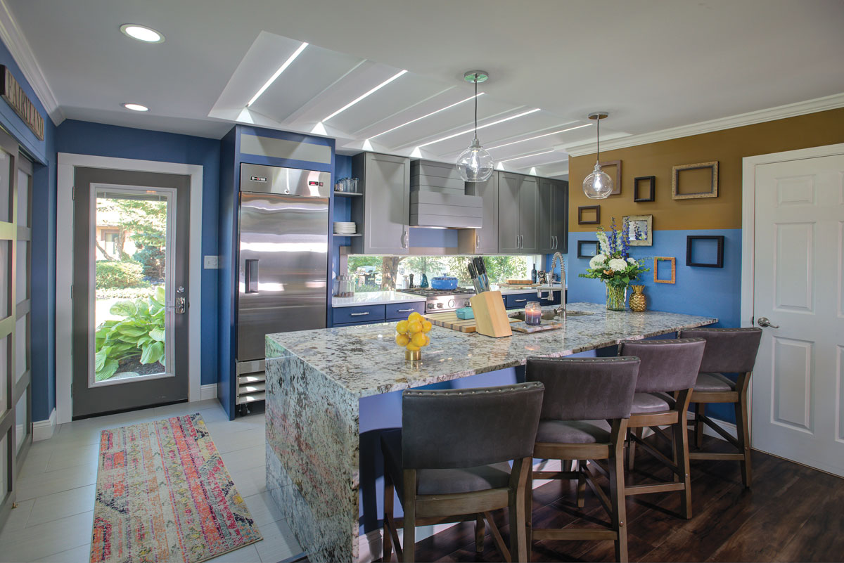 The color scheme would be based on Joe’s favorite color – blue. Flat-panel upper cabinets – painted gray – would add to the modern spin.
