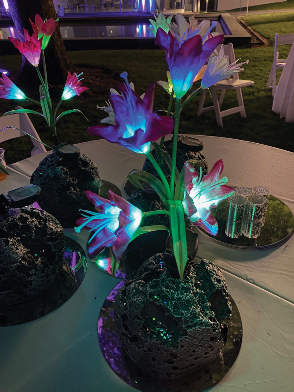 Repurposed “moon rocks” from the canceled 2020 lunar-themed Cosmic Bash were paired with solar-powered, lit-from-within flowers to create centerpieces for tables inside the tent.