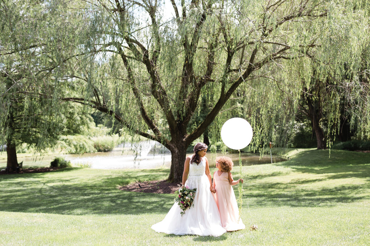 Children in Wedding Photos: To keep the youngest members of a wedding party focused, Dave Murray suggests that you provide them with charming accessories. In this instance, an elegantly simple white balloon “let’s a kid be a kid,” he says. Credit: Ashley Elizabeth Photography.