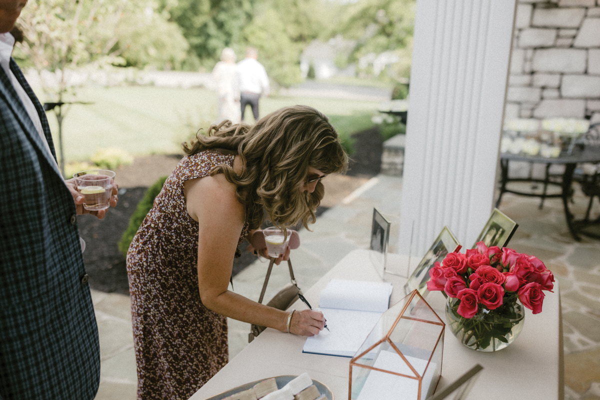 “We wanted it to be a wonderful wedding,” Tracy explains. “We wanted everyone to feel the love, live in the moment and enjoy our home here in Lancaster.” Megan and Tommy, who wanted their wedding to feel “warm, vibrant and joyful,” made their intentions clear in the invitations and on their website: the dress code was wear what makes you comfortable, hence guests wore everything from black tie and cocktail dresses to shorts and sundresses. That sentiment applied to Tommy and his groomsmen: they went from wearing tuxedos to more casual blue suits.