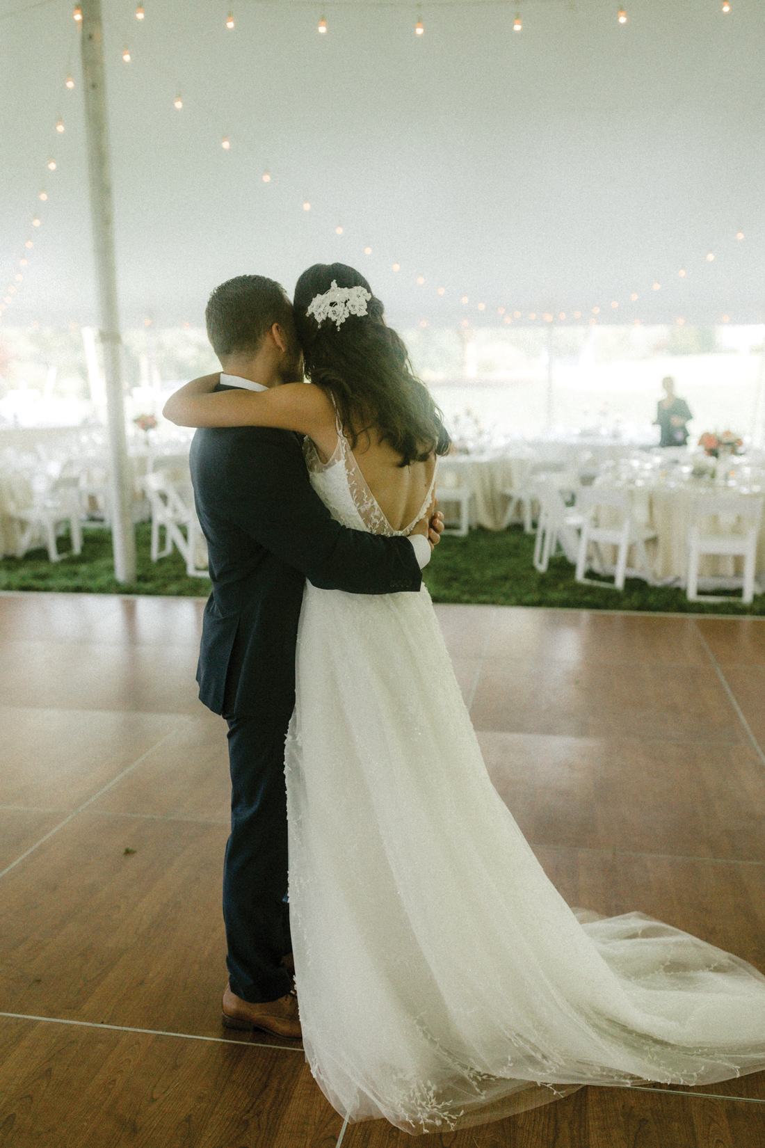 Tommy and Megan survey the tent from the dance floor ahead of the reception. Their first dance was to Shelter From the Storm by Bob Dylan.