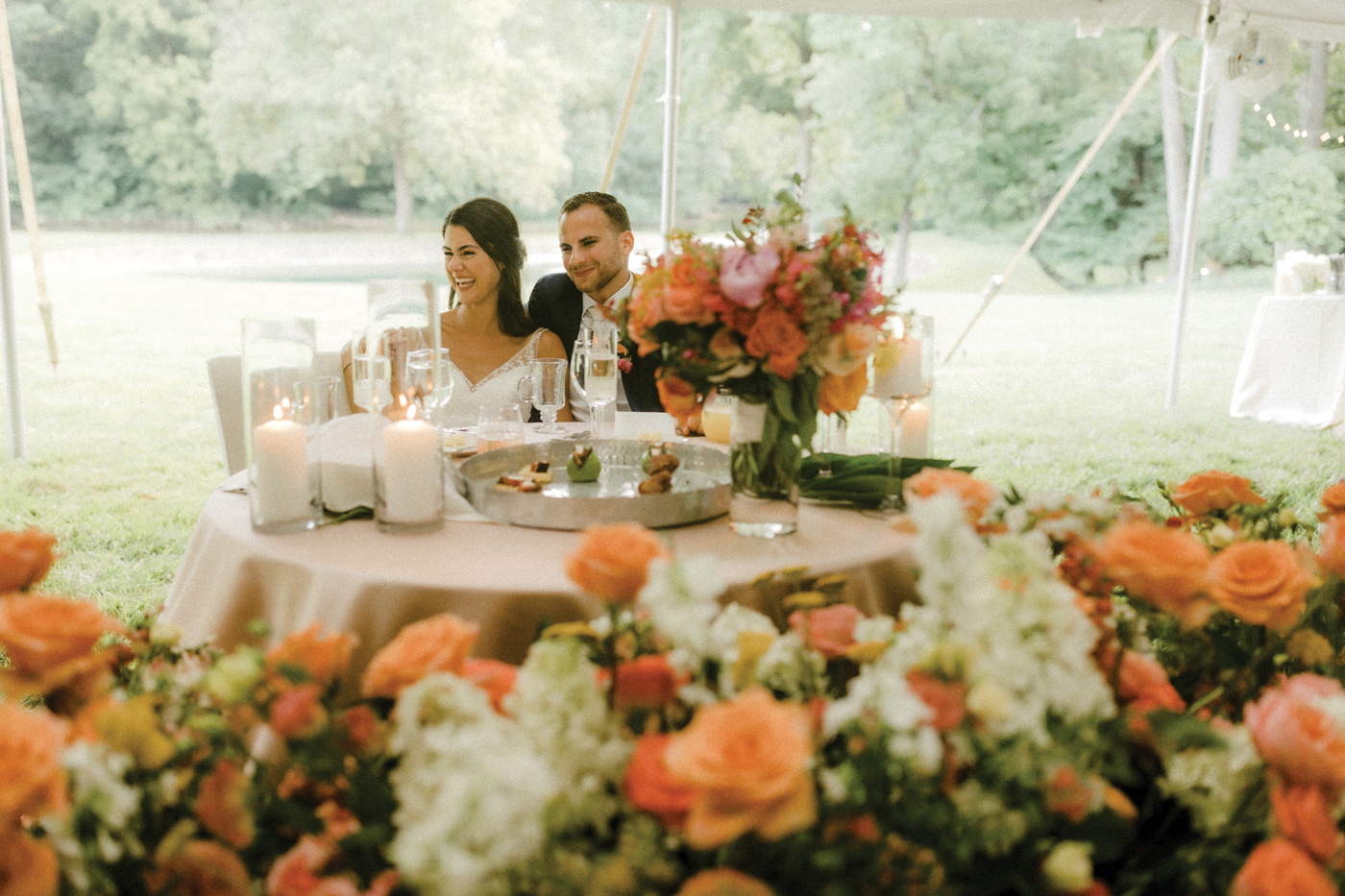 The wall of flowers was removed from the ceremony site and repurposed to frame the couple’s sweetheart table at the reception.