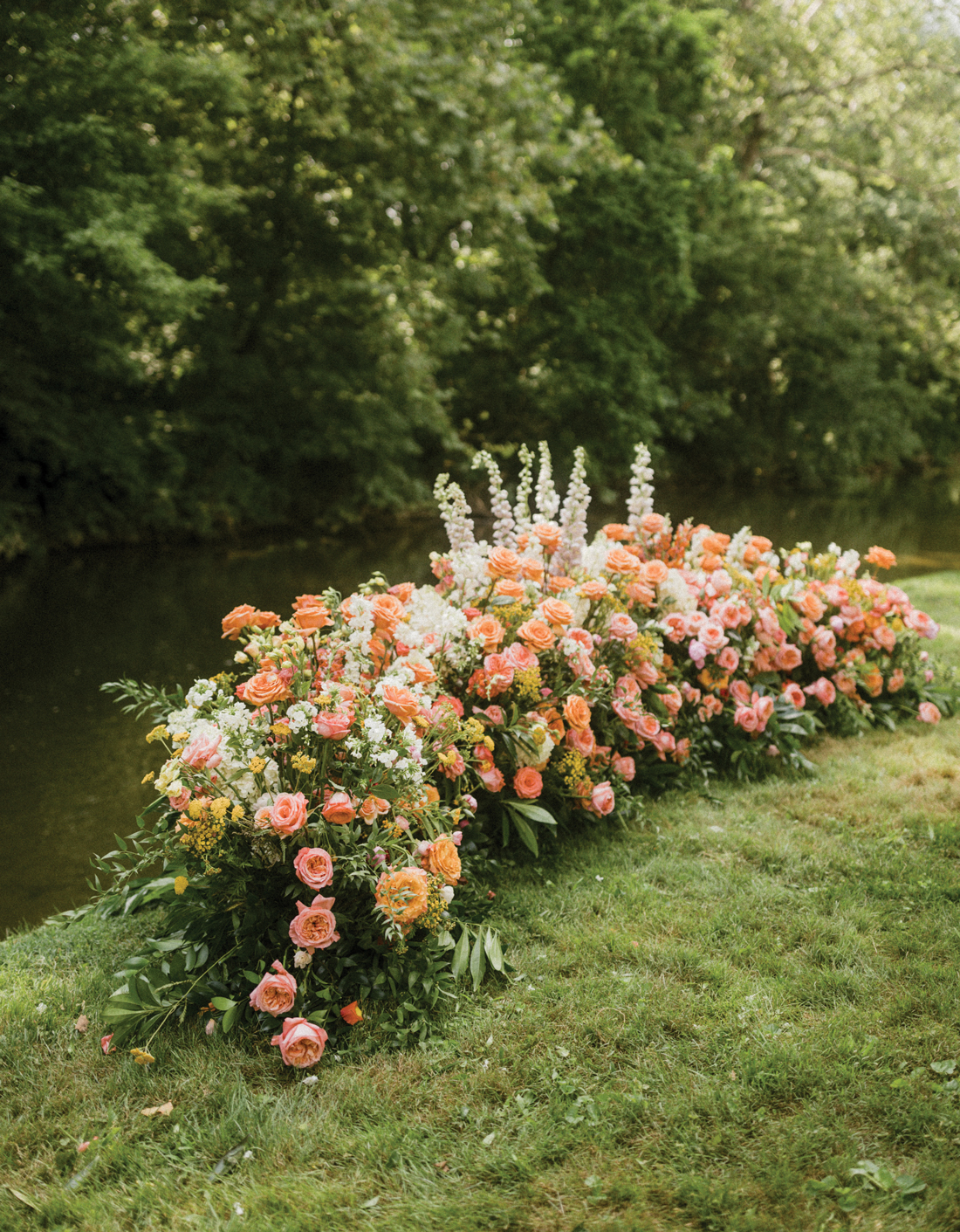 A wall of flowers that exemplified summer decorated the Mill Creek island that served as the ceremony site.