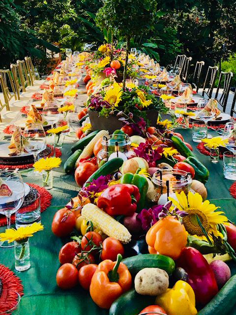 Here’s a pic that demonstrates using organic additions to a floral display that Tim Arpin of The Gilded Lily created several years ago. At the end of the evening guests were given shopping bags and were invited to help themselves to the vegetables and flowers. Photo by Sue Long.
