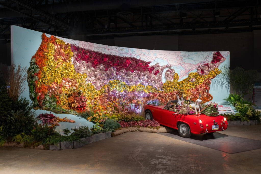 Hyper-locally sourced cut-flowers are another trend identified at the 2024 Flower Show. Jennifer Designs’ exhibit, which depicted a breathtaking floral map of the United States and celebrated how we are all connected through flowers and gardens, utilized hyper-local cut flowers to color-code the floral map according to USDA hardiness zones. The use of locally sourced cut-flowers in this display shed light on the carbon footprint of mass-grown imported flowers.