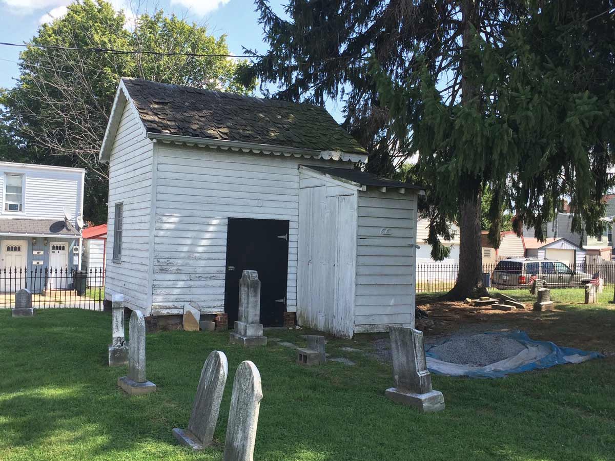 The shed as it originally stood in Mount Bethel Cemetery. A lack of accessibility and a deteriorating roof prompted the cemetery’s board to consider its future, giving Dave the
