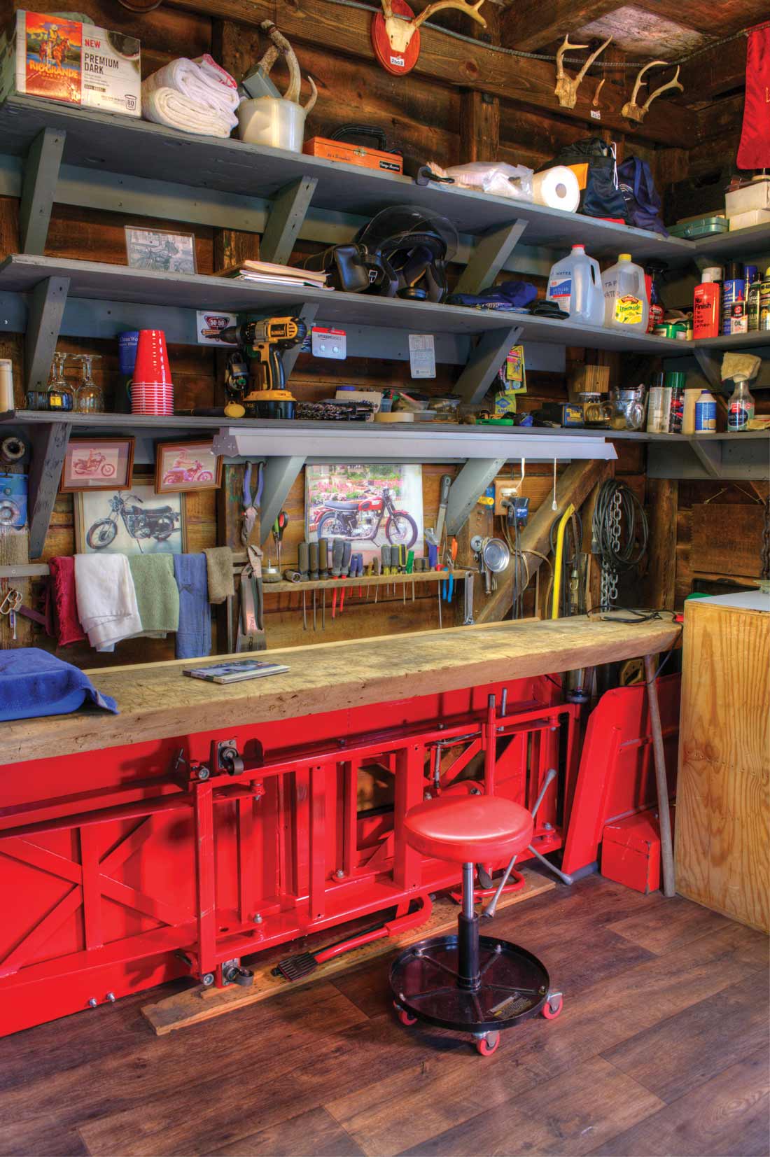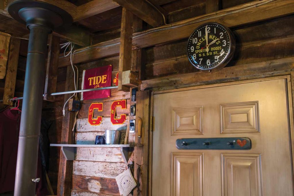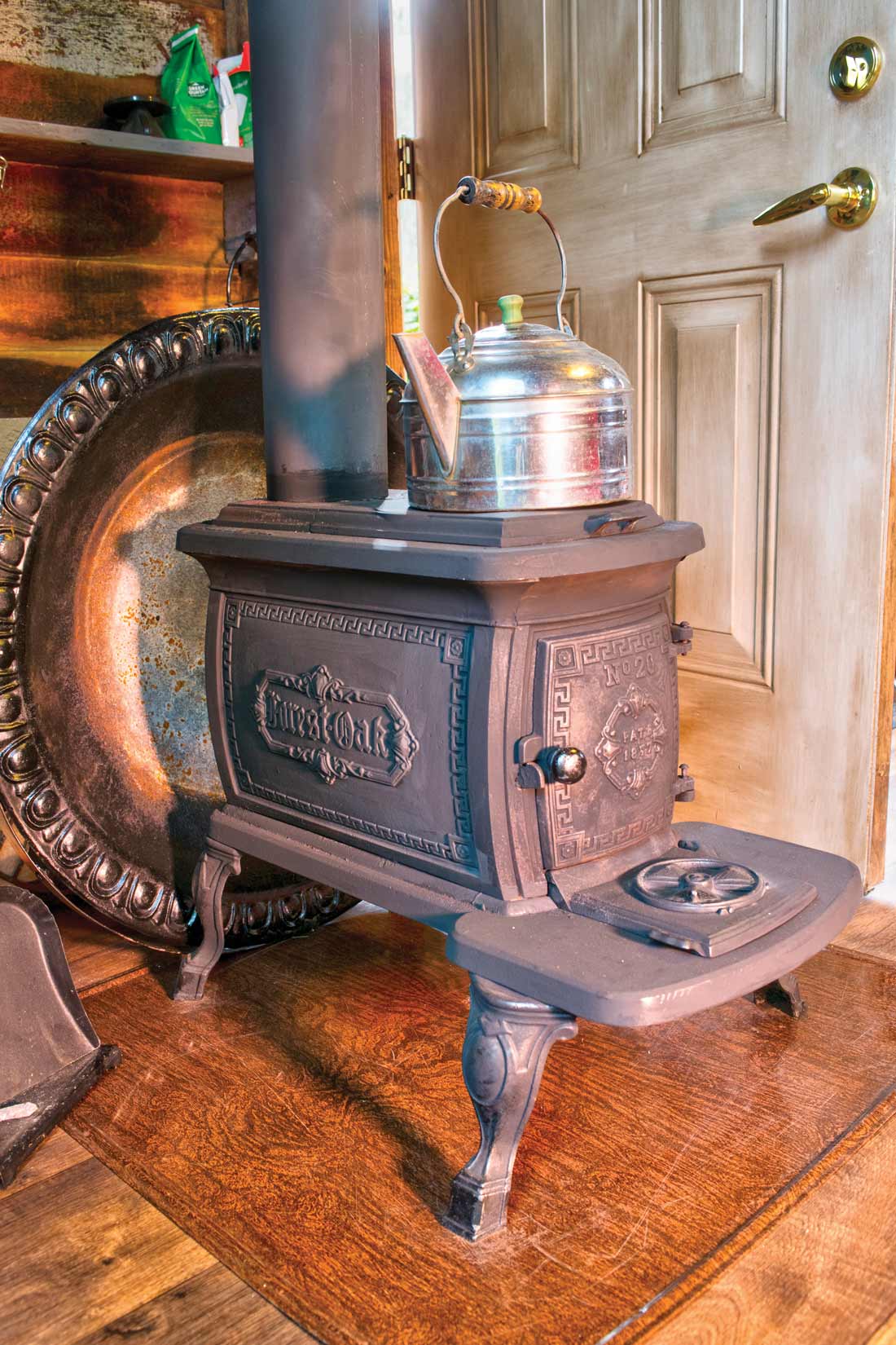The inside of the shed is pure man cave. The wood-look linoleum floor (a bargain-basement find at Ollie’s) perfectly complements the rustic structure. An expansive tool shop is equipped with the remnants of Dave’s handyman business. Creature comforts include a small television, a fridge and a Keeley #20 stove (made in Columbia) that probably dates to the mid-1800s. “It heats the shed up really well,” he notes of the relic he purchased from an antiques dealer.