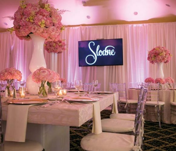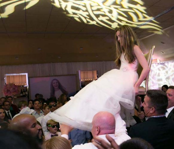 A radiant Sloane in a blush gown made her entrance into the ballroom carried high on the shoulders of Jordin’s dancers. Throughout the evening, many Jewish traditions were observed: Sloane addressing her guests as a young adult, thanking her parents and welcoming her guests; the candlelighting to honor people who have played significant roles in her life; the challah-cutting and father-daughter dance; Sloane being lifted on a chair on the dance floor and guests dancing the Hora, a joyful dance of hands joined in a circle with the party’s hosts.
