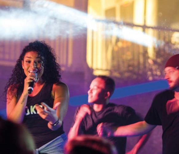 A bat mitzvah celebration brings three or more generations together, so the event must be appropriate and appealing for all ages. Sloane’s friends gathered in their own alfresco party room on the club’s terrace. Three makeup stations, powered by a professional makeup artist, offered hot-pink eyelashes and other glam beauty accessories, plus temporary henna tattoos. Guys and girls shot hoops with gold and silver mini-basketballs. A step-and-repeat photo backdrop made the perfect selfie station. Every young guest had a storage cubby set up to stash their gear, and it was filled with a surprise gift of shorts or sweatshirts and socks to let them get comfy later in the evening as the dance floor heated up and it was time to lose the shoes.