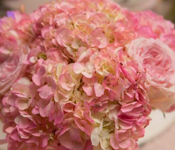 Oohs and aahs were audible as the 180 guests moved to dinner through a white-draped hallway, softly lit in pink and icy blue, to the unveiling of Bent Creek’s transformed ballroom. The walls were swathed in blush-pink fabric, the ballroom’s chandeliers removed and replaced with soft uplighting washing the walls, and gobo patterns lighting the ceiling. Shell-pink tufted couches surrounded a white and gold dance floor, creating lounge areas in addition to elegant dining tables, each embellished with oversized, towering floral arrangements of tightly packed pink roses and lush hydrangea.