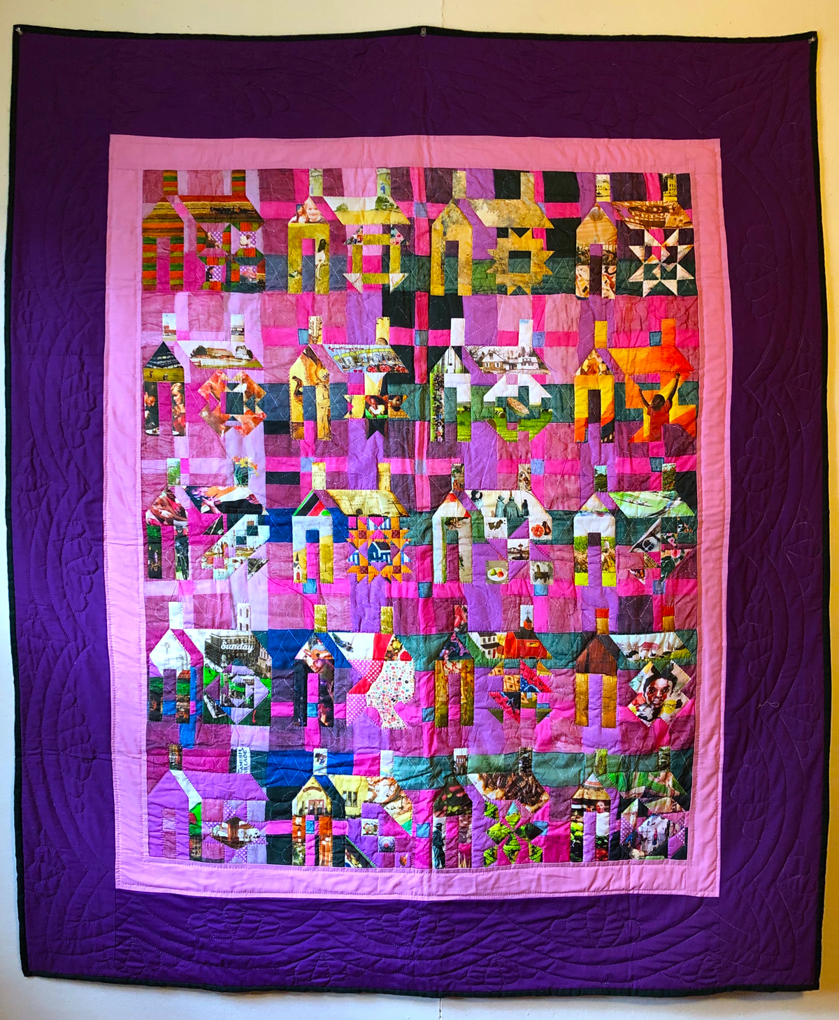 60-foot image, comprised of nine quilts depicting sites from Lancaster, functions as a map of Lancaster’s incarceration data as it compares to state and national rates.