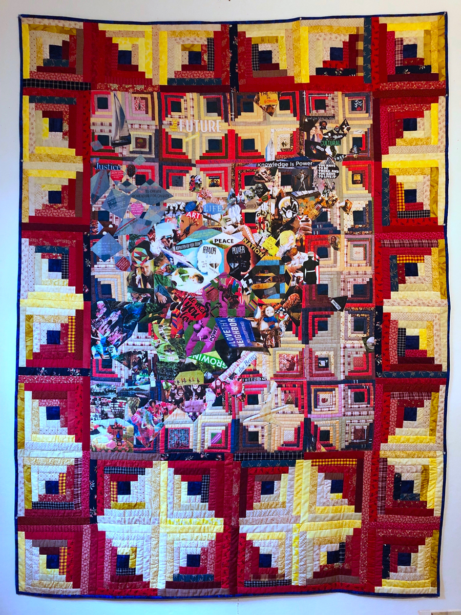 A hand-sewn quilt that incorporates imagery created through a series of community outreach workshops held by Jesse. Workshop participants were asked to collect images from newspapers and magazines relating to safety, justice, equality and freedom. Then they were instructed in image-collage techniques, image transfers and painting.