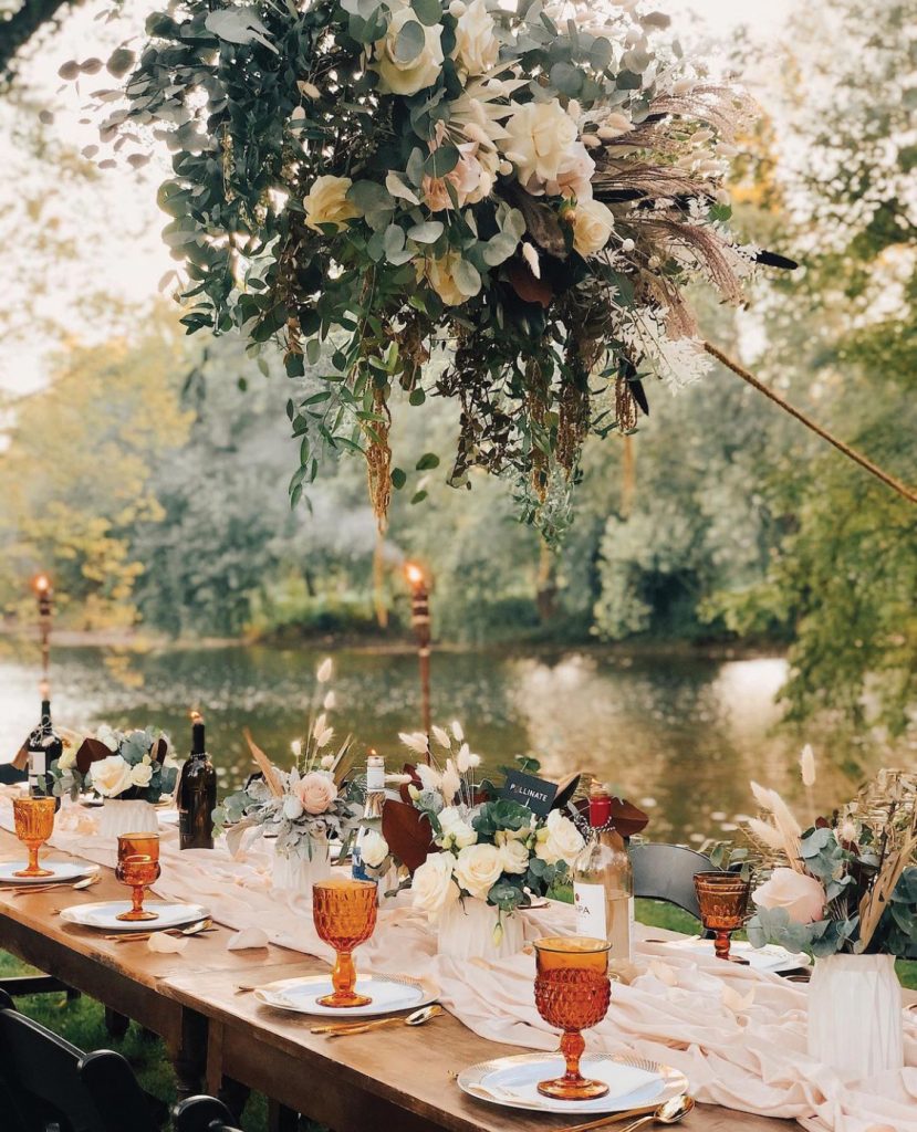 The dramatic focal point – a floral “centerpiece” overhead – was created by Pollinate’s Christine Graham.