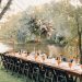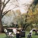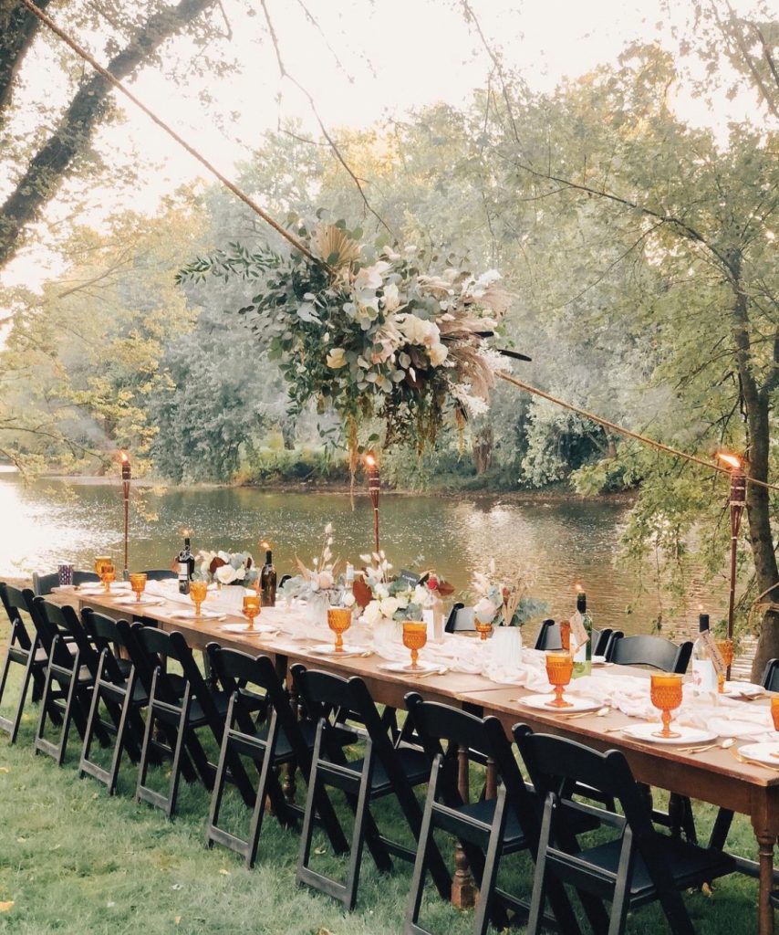 The “centerpiece” was a spectacular arrangement of pastel florals and abundant greenery, suspended above the table on a 65-foot rope, tied between two trees. Christine Graham, owner and designer at Pollinate in Strasburg, conceptualized the dramatic overhead arrangement. “Christine’s work looks like it could have grown there,” notes Carey, who aims for an organic look rather than a “decorated” effect. Likewise, the soft, earthy approach reflected the guest of honor’s taste. “Bright florals wouldn’t have suited Hailey,” she notes. “This spoke to her style.” Five small arrangements on the table echoed the large hanging arrangement in a combination of dried and fresh florals.