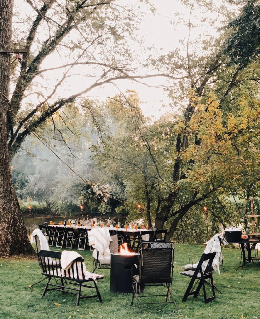 While the late fall event was held amid pandemic concerns, the menu for the small gathering was purposely simple. Charcuterie boards for grazing were followed by sushi from Hailey’s local favorite, Wasabi Japanese Restaurant in Willow Street, allowing for individual servings and no onsite preparation and easy cleanup. Couture Cupcakes was sourced for updated individual servings rather than a traditional cake. After dinner, guests moved to seats surrounding the nearby firepit, thoughtfully accessorized with blankets as the night turned chilly.