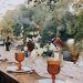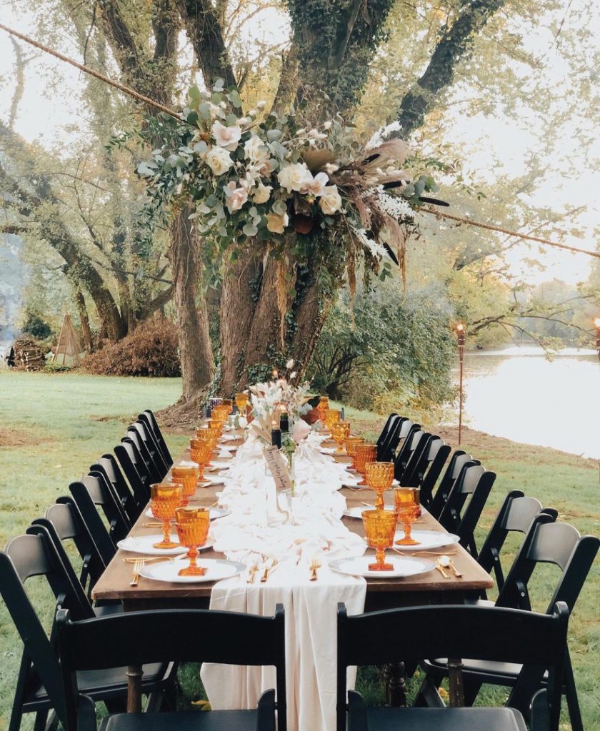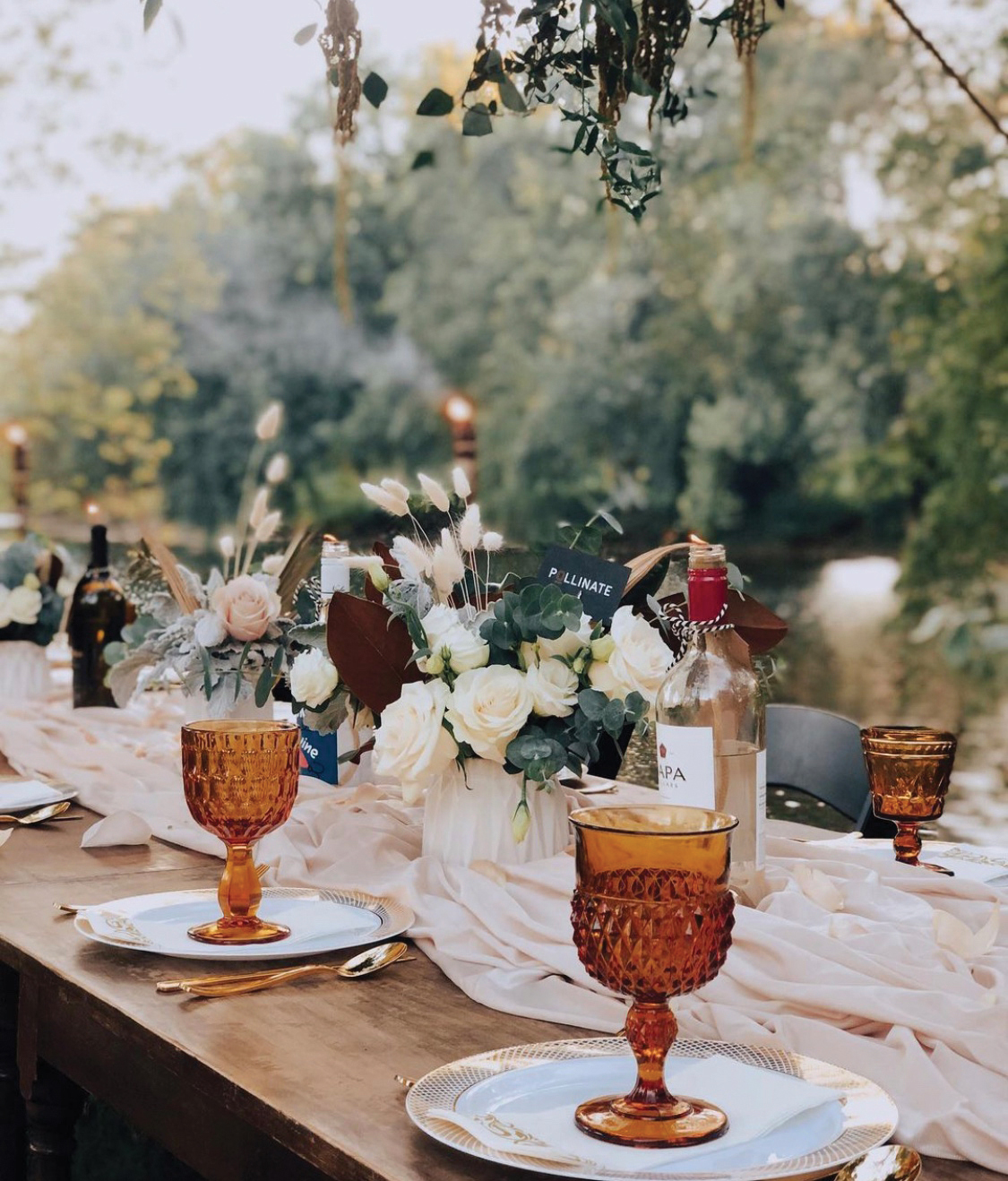 Carey’s love of the “boho-chic” lifestyle shined in the outdoor setting for the party. Using neutral colors, she anchored the tablescape with a flowy textural runner, gathered and bunched in the center of a long, natural wood farmhouse table from Caroline’s Rentals in Paradise. Empty wine bottles filled with lamp oil and topped with ceramic wicks allowed for real flames without the risk of candle wax spills. Tea lights provided additional ambient light, while amber goblets added warmth to the tablescape.