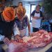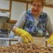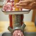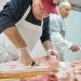 For measuring ingredients to mix with the sausage, weight is used instead of volume to ensure better accuracy. To calculate those numbers, the quantity of pork must first be weighed, so a bathroom scale is used (minus the weight of the person holding the container). From there, sausage is ground into a finer consistency and fed into natural casings to make sausage.