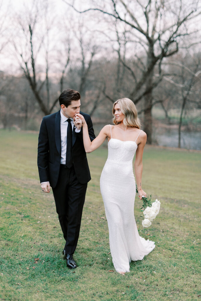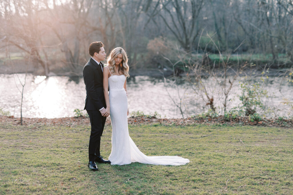 The Conestoga River, which flows past Riverdale Manor, provided the backdrop for Hailey and L.J.’s first-look photos. The property features several outdoor natural areas/gardens for ceremonies, an all-seasons pavilion, a 19th-century farmhouse with a bridal suite and groom’s room, a garden terrace (with a two-sided fireplace) and a ballroom with a soaring ceiling and a plethora of windows and French doors. Riverdale Manor is also the home of Thyme & Seasons Catering.