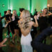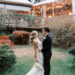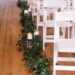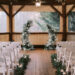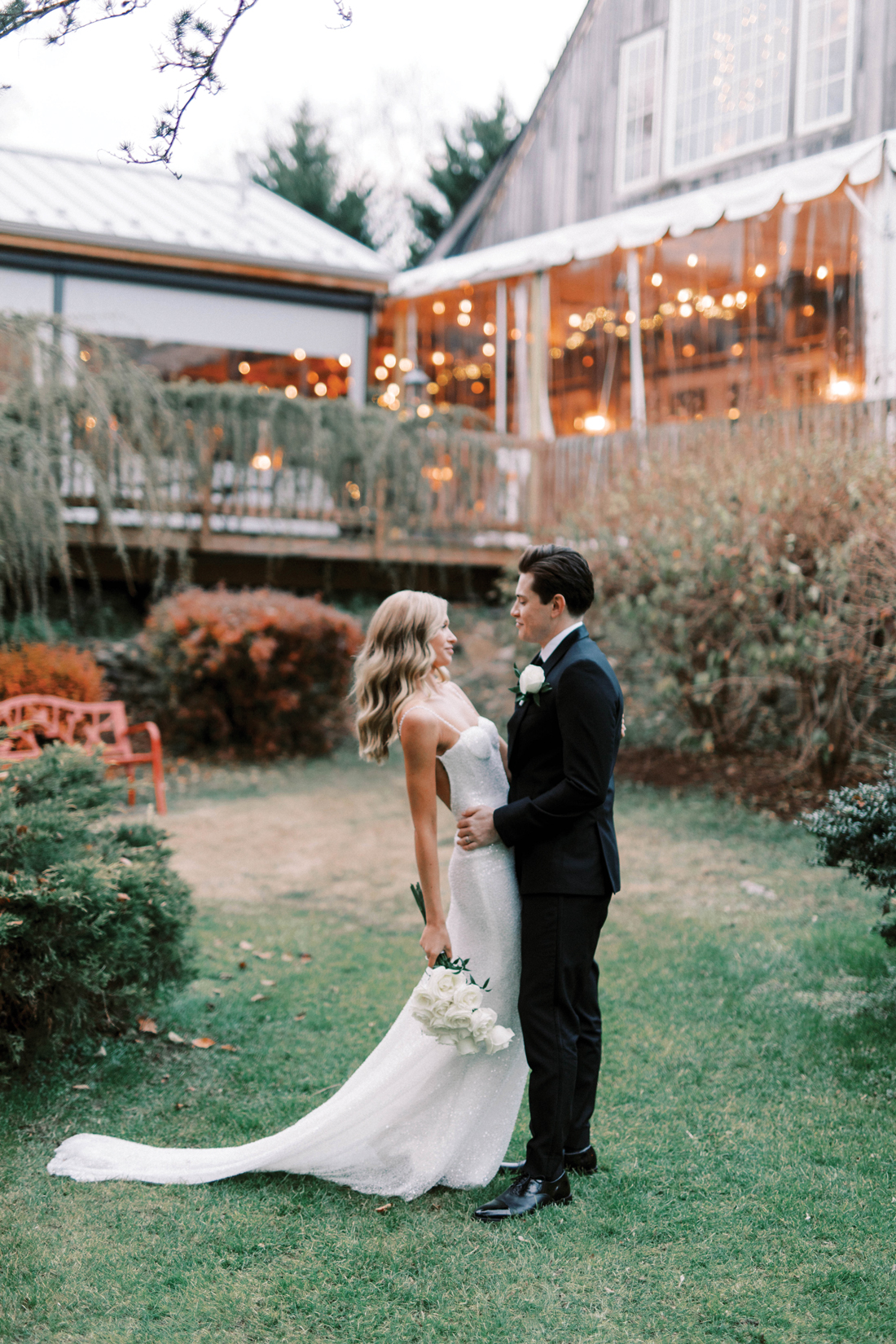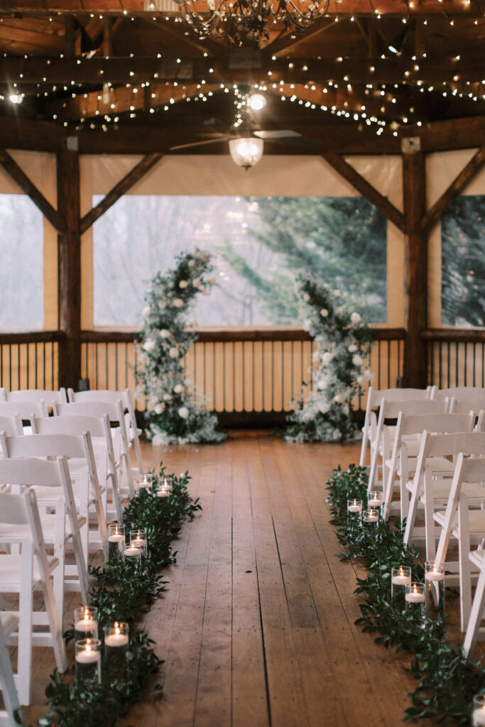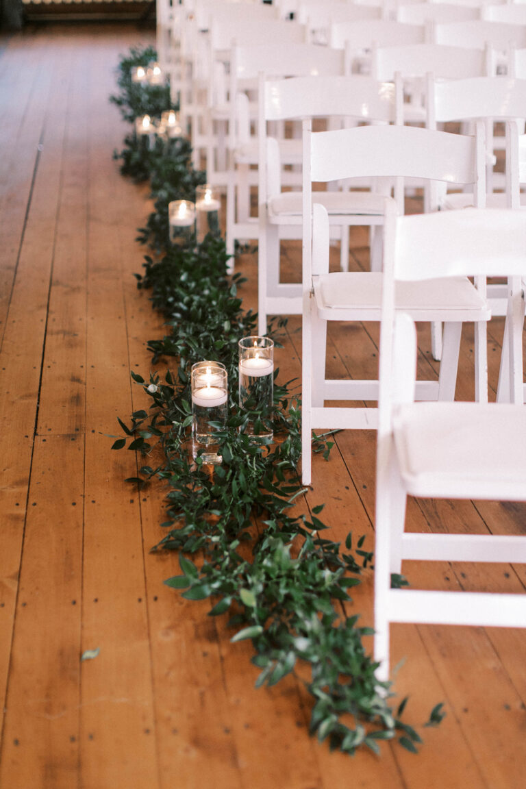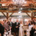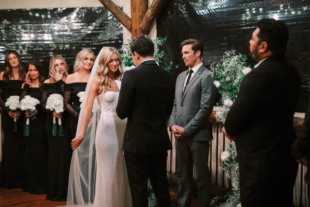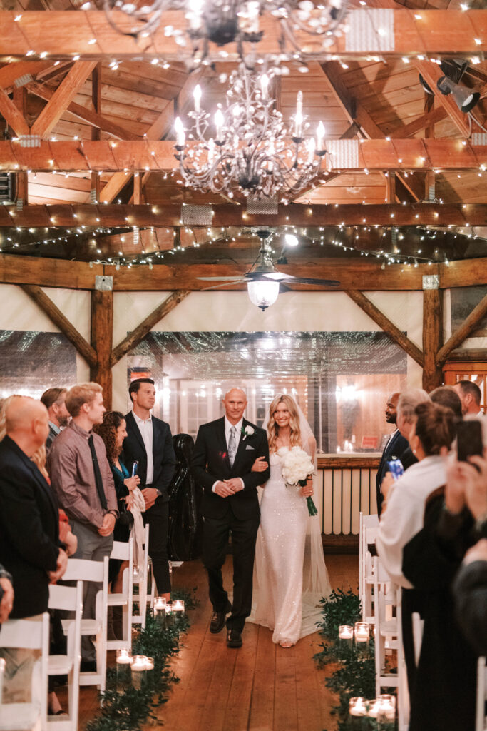 The ceremony began as a string quartet’s harmonies wafted to the open rafter beams that were wrapped in tiny lights. Crystal chandeliers added a note of elegance to the setting. Floating candles in glass cylinder vases dotted the greenery-lined aisle as mother-of-the-bride, Jessie, made her entrance in a charcoal sequined sheath.