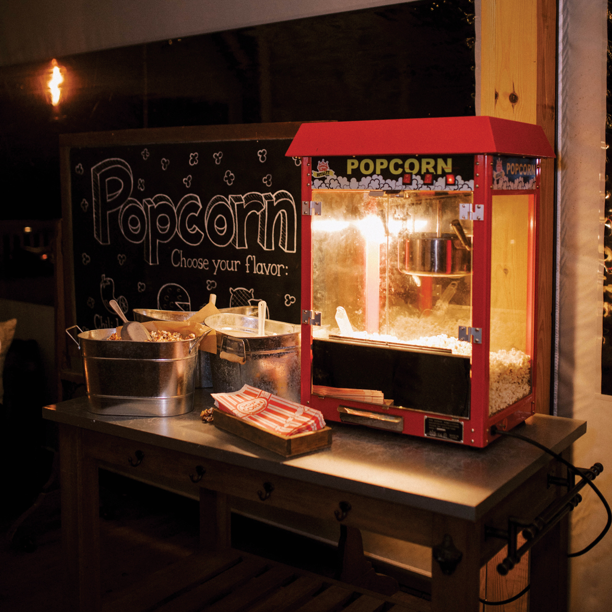 Following toasts (the best man’s in the form of a rap song) and dancing, guests re-energized with a late-night, salty-sweet treat from a vintage popcorn machine.