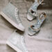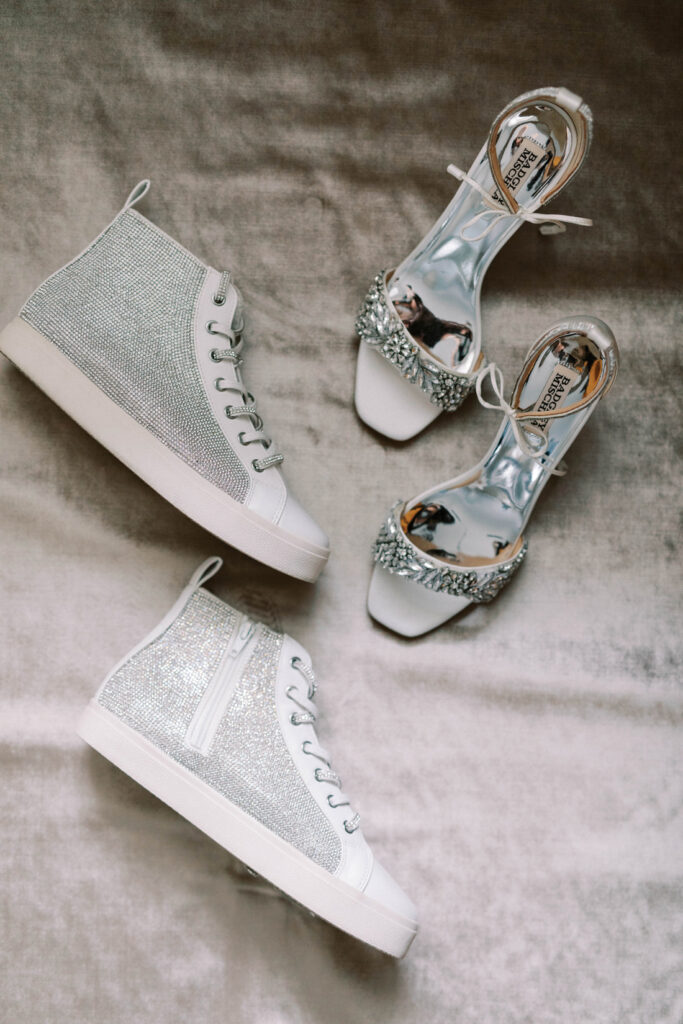 Two pairs of shoes were needed, one for walking down the aisle and the other for dancing the night away. Mid-reception, Hailey would step out of her Badgley Mischka stilettos and into sparkling high-top sneakers.