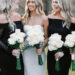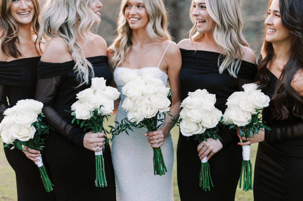 The black-and-white color scheme that was so popular in the ’70s has staged a comeback. Hailey’s attendants were dressed in long, black, off-the-shoulder gowns and carried white flowers. L.J., who wore a black tuxedo, and his groomsmen, who were attired in black suits and white shirts, echoed the color scheme, which was also reflected in the invitation suite, menu cards and reception décor.