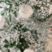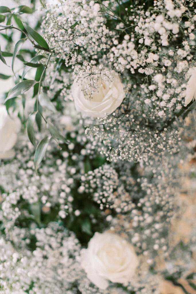 Baby’s breath is having a moment and the ceremony and reception areas were awash in clouds of it. White roses, eucalyptus and ruscus also figured into the floral designs.
