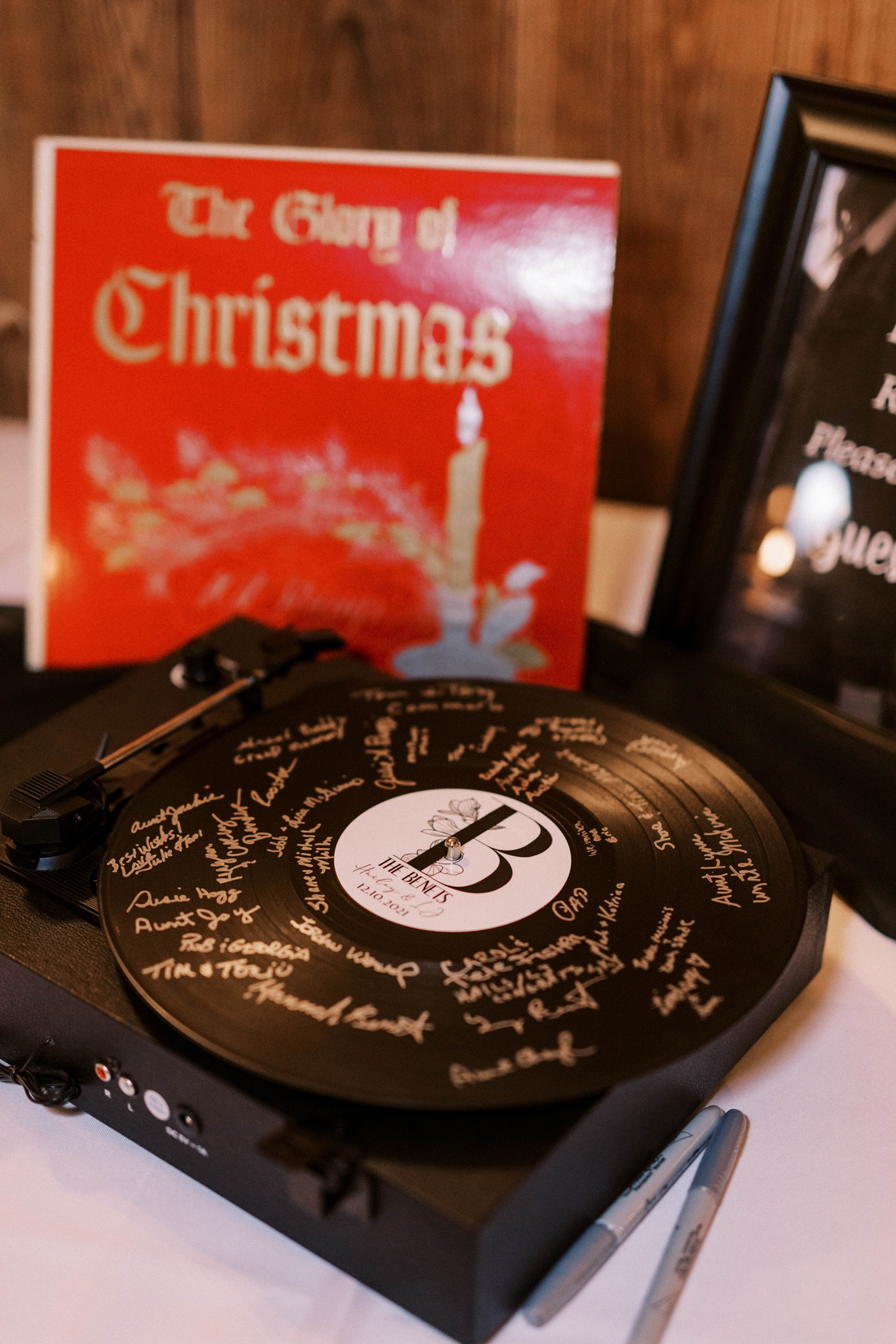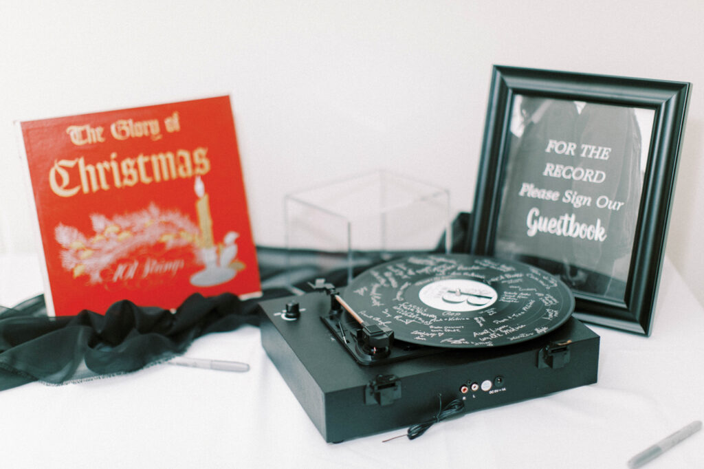 WeddingTok reports that traditional guestbooks are old hat and couples are now asking guests to convey their best wishes via voicemail (recorded on a vintage rotary phone), on puzzle pieces and game boards and on holiday ornaments. Hailey and L.J. had guests sign a vinyl record album.