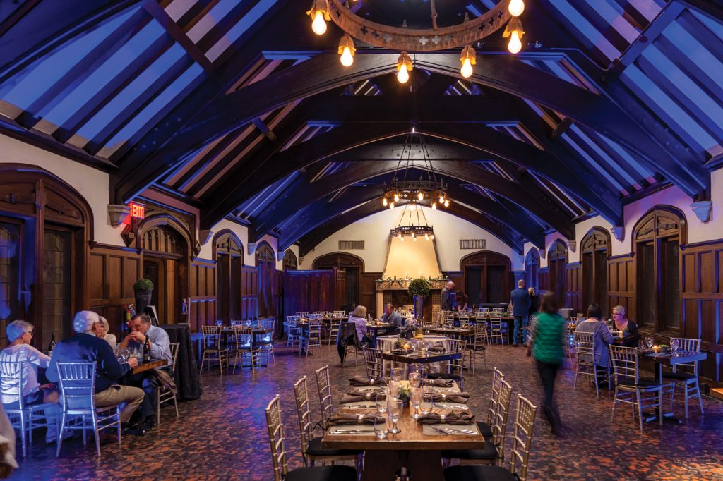 The restaurant’s setting simply oozes character. Dietz Refectory, which dates back to 1916, was built in the Tudor Revival style and features timber roof trusses, as well as two large fireplaces whose mantels boast original Mercer tiles crafted by the Moravian Pottery and Tile Works in Doylestown. The windows, which are embellished with stained-glass medallions, were made from green glass that was repurposed from Belgian greenhouses damaged during World War II.