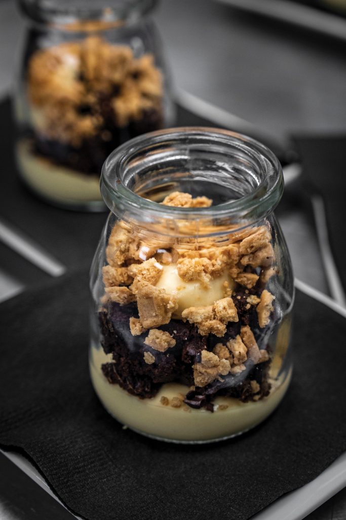 The November Petite Sweet offering: chocolate-fudge cake with vanilla custard, nutter butter, cacao nibs and sea salt.