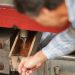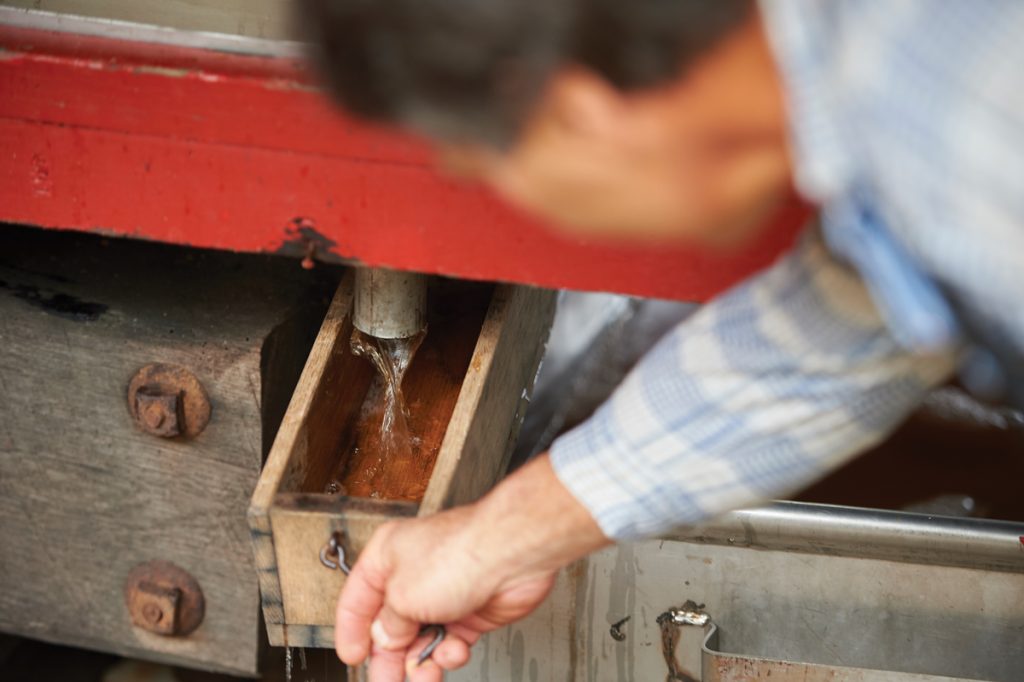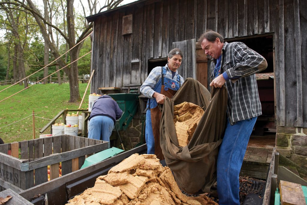 After mashing, the apples are pressed between wood tightened with large threaded rods. The tractor motor is cut back to quarter speed with the occasional pause to let the cider work its way out under pressure. A sticky-sweet mist fills the air during pressing, and if only for a few days, the operation breathes life and relevance into the century-old process. The mash is pressed, creating the cider, and the dry pulp is used as animal feed. The complete cycle takes roughly an hour for two layers of apples to be simultaneously pressed.
