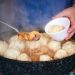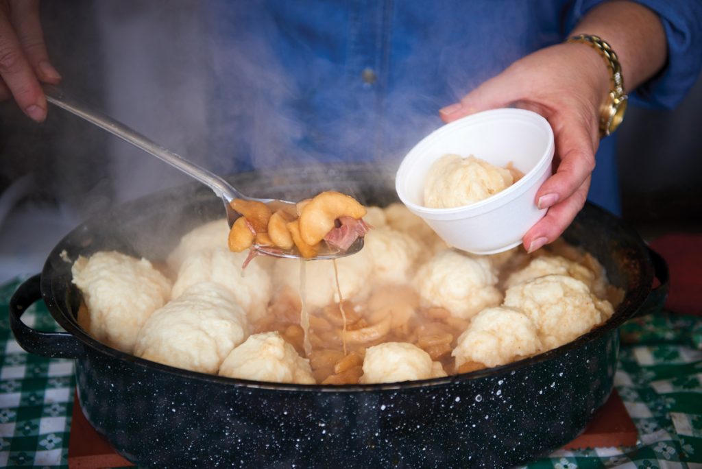 Akin to a pork and sauerkraut meal on New Year’s Day, this treat was traditionally reserved for a Sunday or Christmas dinner. According to those who prepare the dish for the festival, apples were once coveted over long winters, and serving them with ham was a long-held Christmas tradition. Combining the two yields a hearty, sweet-and-savory dish that sticks to your ribs. A bone-in ham (or the alternative, pork shoulder) adds richness to the flavor.