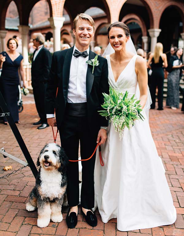 Their day began as a picture-perfect, warm fall day, the Saturday of Halloween weekend. It was a year ago that very weekend that Lee moved back to Lancaster to be closer to Chad and a new career opportunity. Guests were invited to St. James Episcopal Church at Duke and Orange streets to witness the vows at 2 p.m. Arriving guests were greeted outside the church by a four-legged family member, the couple’s dog, Otis. “We came up with the idea of including Otis in the big day as we were walking him through the downtown streets a few months before,” Lee explains. “He already had a natural tux,” Chad notes, citing the Bernedoodle’s signature black-and-white markings.