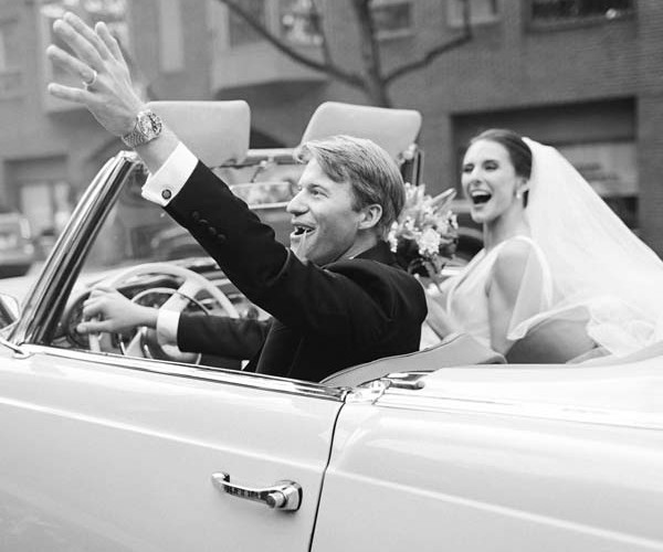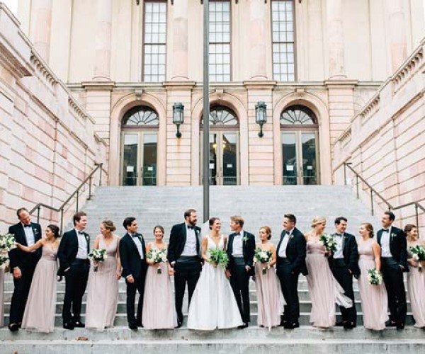 As guests gathered outside the former Watt & Shand building, where four generations of the bride’s family had been involved in the business, a photographer and drone were poised high above the crowd. The bride and groom arrived at Penn Square in a vintage ’66 Mercedes convertible; they joined the party, and the shot was ready to be snapped.