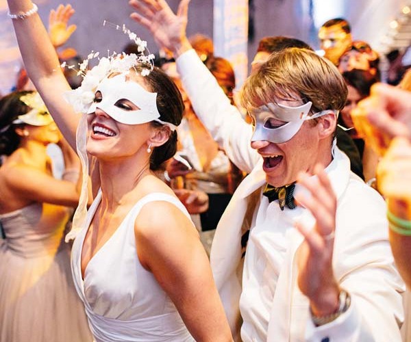 Following dinner, dancing resumed downstairs and, in a nod to Halloween, glitzy masks were passed around by the waitstaff; the evening morphed into a glamorous masked ball.