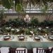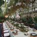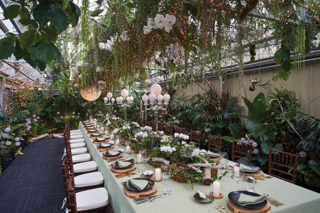 To create the requisite forest look, Tim and James created custom planters that were wrapped in sheet moss and planted with orchids, ferns, ginger plants, peace lilies, bird of paradise, creeping fig, ivy, alocasia and rattlesnake calathea. Birch branches also filled the 20-foot-long planters that encircled the interior of the greenhouse. A miniature version of the planters traveled the length of the dining table.