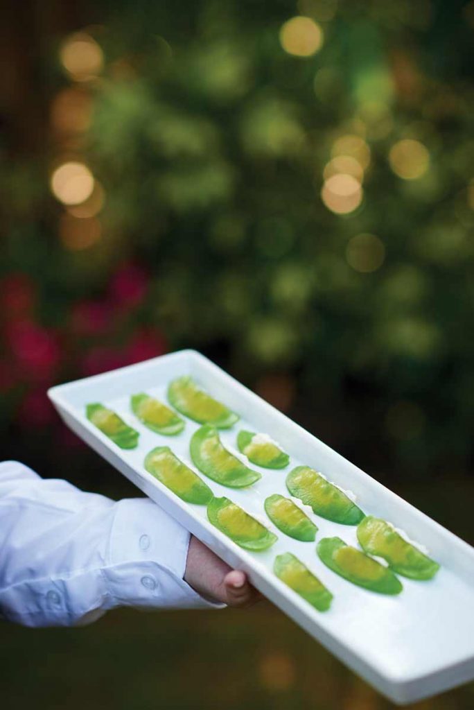 But, before the sun began to set in the west, guests were entertained in the tropical gardens that define the backyard. So as to change up the look for guests who are frequent visitors, Tim and James rearranged the furniture, moving it from the deck and patio and onto the lawn. The bar, which mimics a tiki hut, was also moved onto the lawn in order to eliminate traffic jams. “Moving the furniture created more mingling space,” Tim explains. The deck was turned over to harpist Louis Lynch.