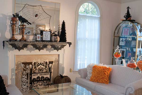 The fireplace in the living room was fully decorated for the occasion. The seasonal-hued pillows came from Peggy’s stash of staging supplies. The containers of candy accounted for a guessing game that Peggy and Tanya devised. All the picture frames in the house were changed out to reflect the party’s Halloween theme.