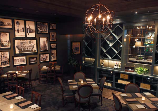 Alison K. McIndoe of A.K. Interiors, who crafted the look of the original restaurant, took on the job of creating a unique look for the Champion Forge locale, which had previously been home to an Italian restaurant and was awash in marble and tile. Taking a cue from the building’s 19th century industrial heritage, brick walls were exposed. Windows throughout the restaurant exude an industrial look, as does the lighting in the bar area. The sweeping bar is topped with stone. A wall is hung with historic photos and framed bills of sale that relate to the Champion Blower & Forge Company, which was founded in 1875 by 17-year-old Henry Keiper, who revolutionized blacksmithing with his innovative products.