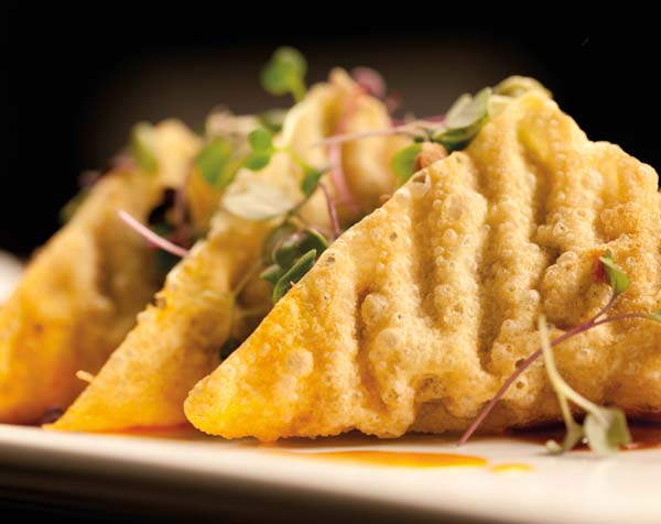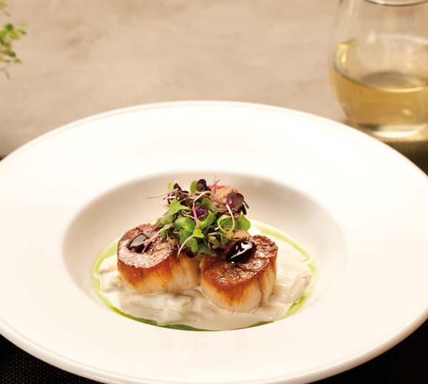 The menu pays homage to Asian and French influences, as well as traditional American dishes with a twist. For example, Peking duck tacos have become a signature item. The free-range chicken is stuffed with croutons, mixed mushrooms, thyme and truffle oil and is served with sautéed spinach and smashed potatoes. The dry-aged New York strip is drizzled with cranberry chipotle demi-glace. The seared diver scallops (from Prince Edward Island) are accompanied by truffled creamed leeks and are finished with a port wine reduction. The menu is updated seasonally; David estimates that about 25% of the menu is changed out to take advantage of fresh, local items, including vegetables. The dessert menu is equally as adventurous and includes items such as crème brulée and house-made ice cream.