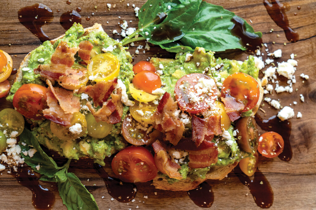 Avocado Toast: Mashed avocado, cherry tomatoes, bacon, feta and basil on sourdough toast with balsamic vinegar.