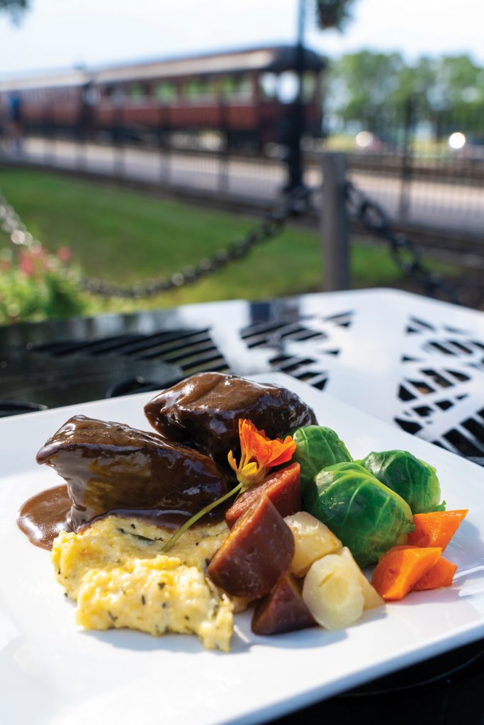 The fall menu for dining aboard the train includes entrées such as braised short ribs accompanied by seasonal vegetables.