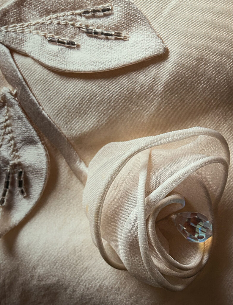 In the end, 50 yards of silk-chiffon taffeta created a very traditional but intricate wedding gown that pleased Mrs. Auchincloss (the price tag was $500), Ambassador Kennedy (a traditional ballgown) and, to a degree, the bride (as she had requested, its color perfectly complemented her grandmother’s cathedral-length lace veil). No doubt the bride was grateful for how well the dress moved and flowed thanks to Lowe’s unseen signature construction elements that allowed for unrestricted movements of the arms and made it easy to dance in. Still, Kennedy felt the gown was not becoming and did not reflect her style, as she was not fond of frou-frou, ruffles and such. She reportedly said she felt as if she looked like a “lampshade.”
