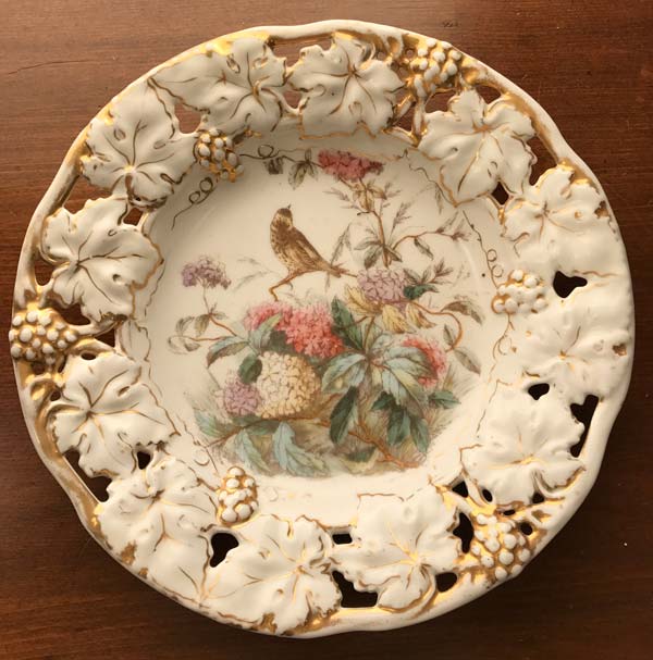 Next, I went to the pottery area where I presented the bowl that had belonged to my grandmother. The bowl’s filigreed outer rim is gilded with gold while the bottom displays a decorative motif of a finch sitting among hydrangeas.