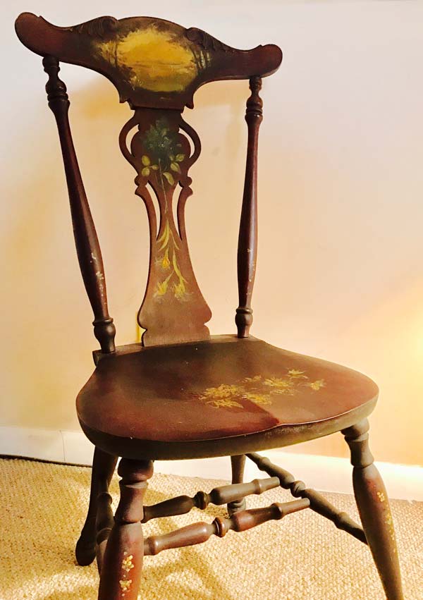 He also pointed out that the hand-painted decorations were in great condition and cautioned me to leave them as is. I was also warned not to have the chair refinished because ruining its original patina would ultimately impact its value.