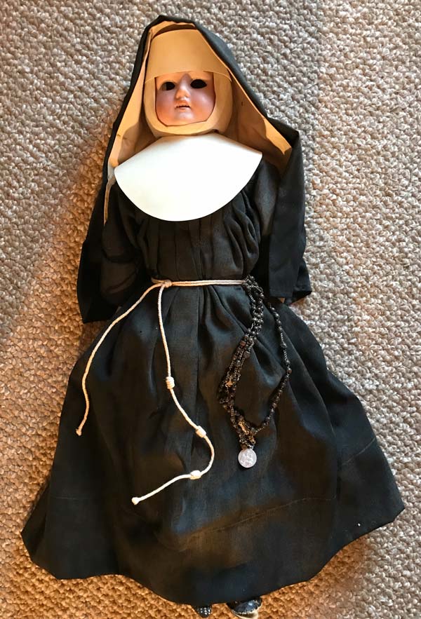 Meanwhile, John was in the doll area. My mother had somehow “inherited” the nun doll from one of her aunts. She figured it was about 80 years old. The nuns at St. Joseph Hospital had dressed her in a habit — complete with a miniature strand of rosary beads — identical to the ones they wore.