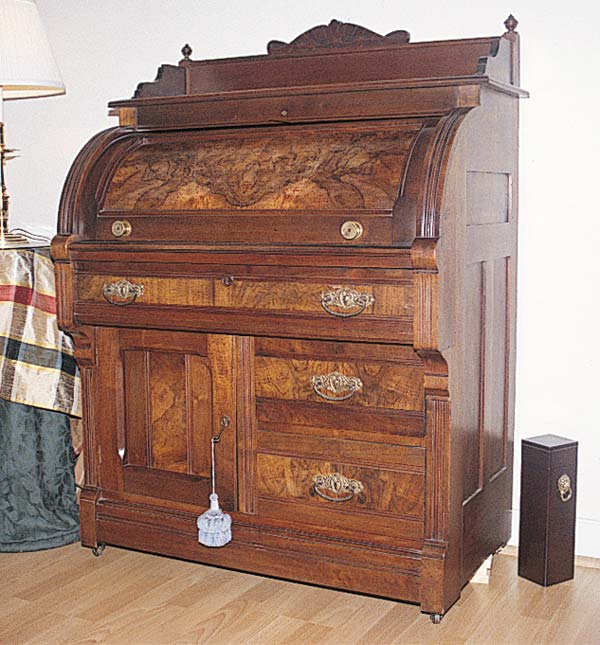 The appraiser studied the photos and pronounced it a very good buy. The cylinder top, made of burled walnut, exhibited graining that was a mirror image of itself. In addition, the rail around the top was intact.