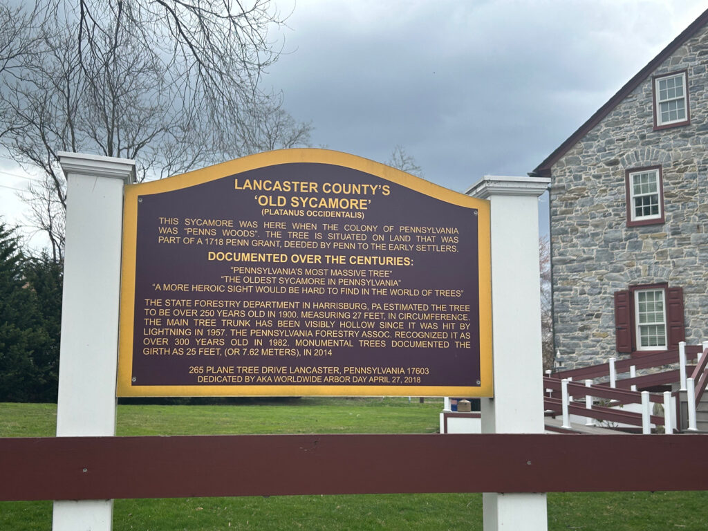 The tree, which is hard to miss, definitely bears some impressive credentials. Considered to be the oldest sycamore tree in Lancaster County, it was probably a sapling even before William Penn launched his grand experiment and welcomed those seeking religious freedom to a place that came to be called Pennsylvania. The tree stands on land that was part of the 1718 Penn Grant through which land was deeded to settlers in what became Lancaster County. Yes, that means the tree is no doubt more than 300 years old. Some estimate it to be as old as 375. (The PA Forestry Association declared it to be more than 300 years old in 1982.) Over the years, it’s been documented as being the state’s “most massive tree,” as well as its “oldest sycamore.” It stood watch over a farmhouse that dates to the 1800s and was witness to the development of the Old Sycamore Industrial Park that grew around it in the 20th century.