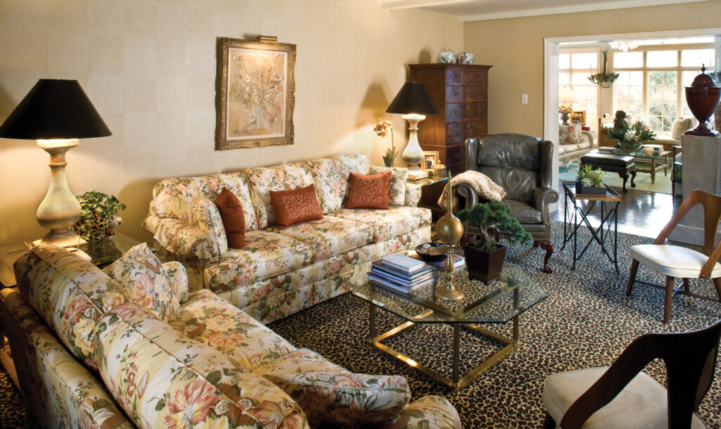 Family Room: The traditional sofa and love seat (covered in a chintz floral fabric) were paired with a leather wingback, chairs by Charles Eames (circa 1930-50), a George II burled-walnut highboy, classic lamps and ultra-modern tables. The animal-skin carpet pays homage to old-style salons, as well as the modern-day perception as it being the new neutral.