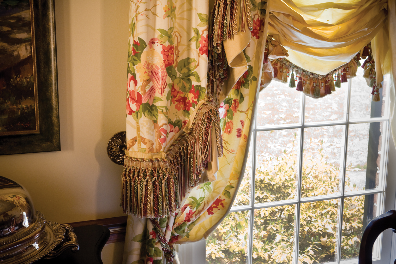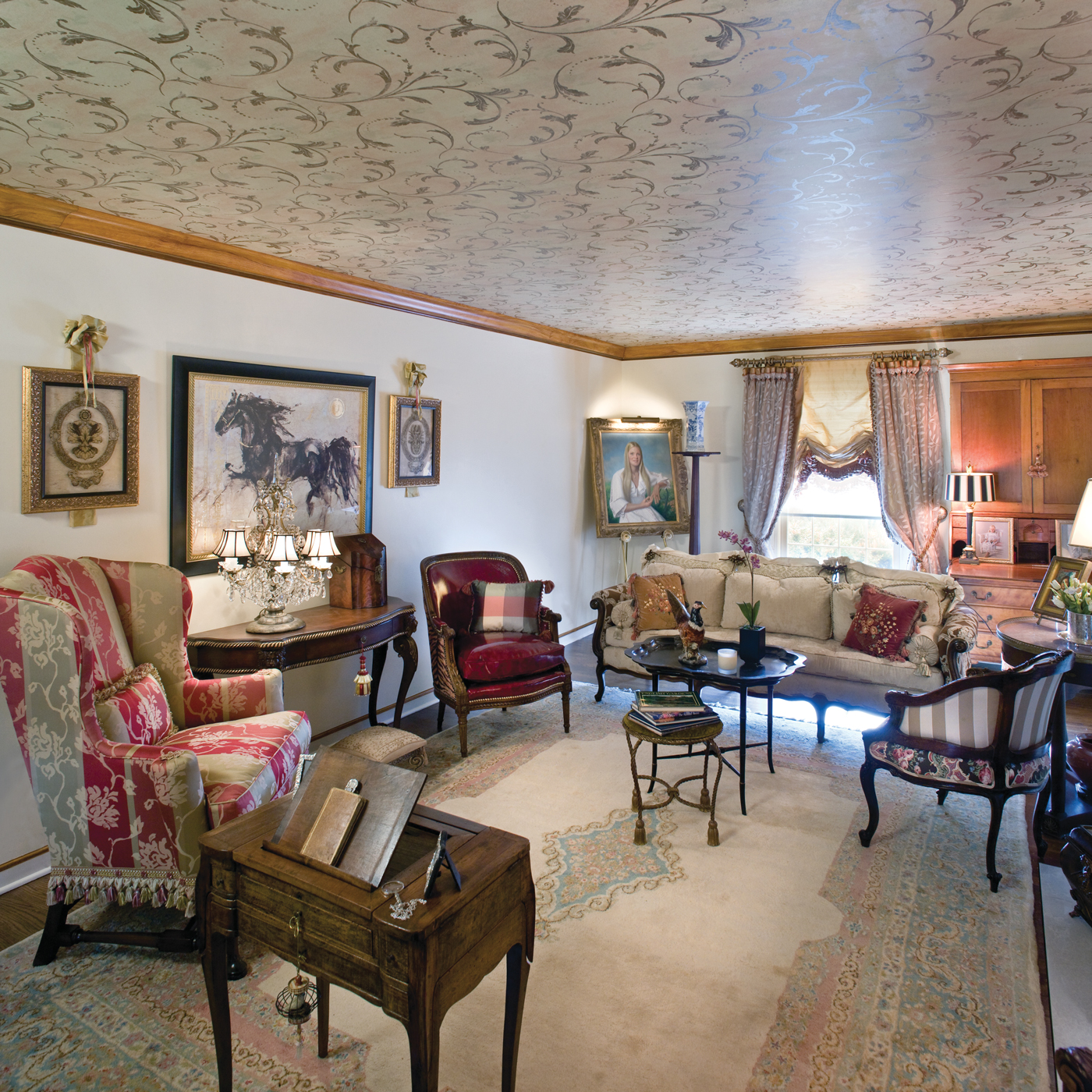 Living Room: John called the living room’s styling “traditional with a twist.” The homeowner’s chairs were all reupholstered in order to bring them “forward in time” and utilized fabrics such as patent leather, animal skin and damask. Other furnishings included an American-made secretary, a George III parcel-gilt console, a Karges sofa, an Italian ottoman and a lacquered tray-table. The Kermin rug is circa 1960s. The ceiling was papered while the molding was faux painted. The draperies were John’s design.
